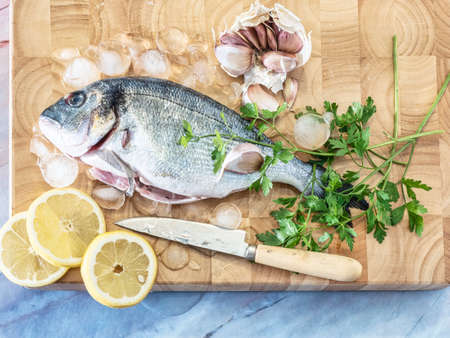 Fresh fish Dorado. Raw sea bream with parsley, onion, garlic and lemon slices covered with ice ready to cook on wooden board. Top view. Marble background.
