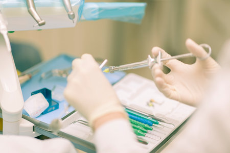 Detail of a dentist performing surgery with anesthesia on a patient for root canal treatment and regeneration. No people are recognizable.
