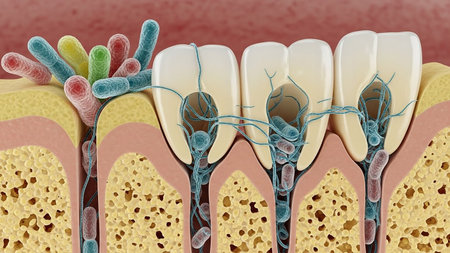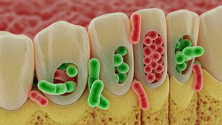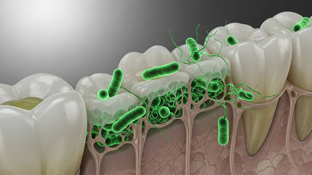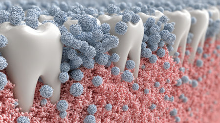 Microscopic view of colorful bacteria colonizing the surface of teeth and along the gum line, illustrating oral health challenges