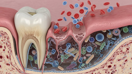 Detailed illustration showing a tooth root and gumline with blood cells and numerous bacteria, depicting an oral infection and inflammation.