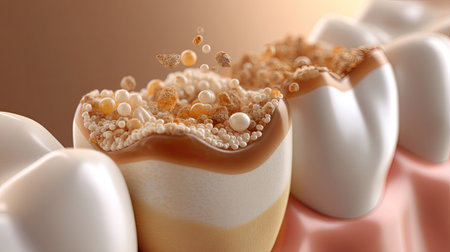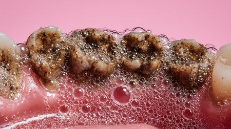 Extreme close-up of diseased human teeth showing plaque buildup, bacteria clusters, and decay in the enamel and gum line.