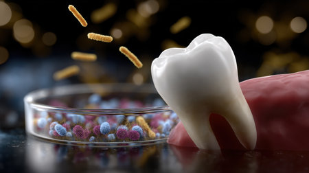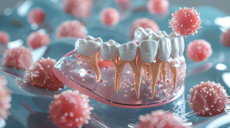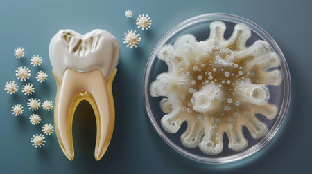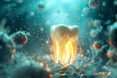Explore this vibrant 3D illustration representing dental health, featuring a tooth, bacteria, and microscopic elements related to oral hygiene.