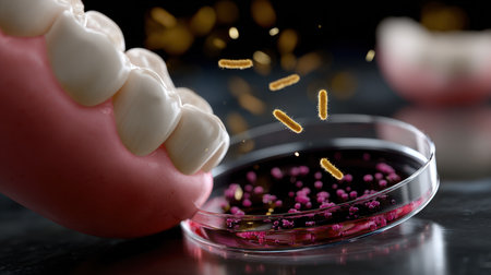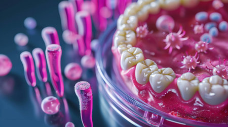 This striking image features a dental model's teeth positioned next to a petri dish filled with bacteria, symbolizing oral health and microbiology research.