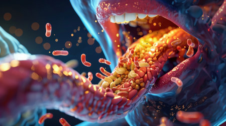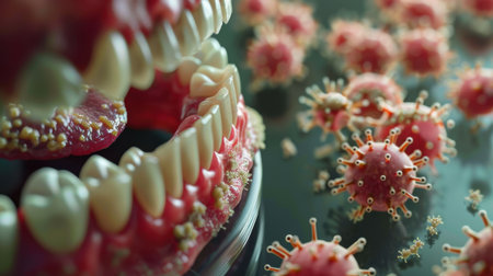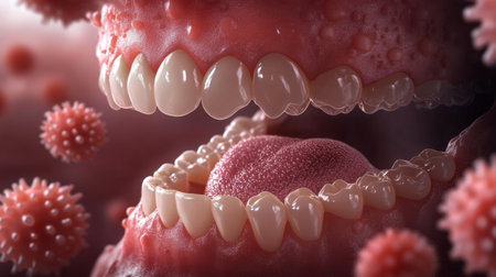 Detailed illustration of a human mouth showcasing teeth and microorganisms, highlighting the importance of oral hygiene in preventing dental infections and diseases.