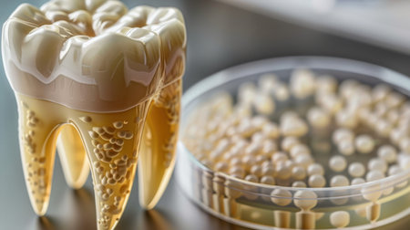 This image features a dental model of a tooth alongside a petri dish containing bacteria, illustrating the relationship between oral health and microorganisms.