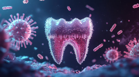 Striking illustration of a tooth amidst bacteria and viruses, showcasing the complexities of oral health challenges and the microscopic world of dental hygiene.