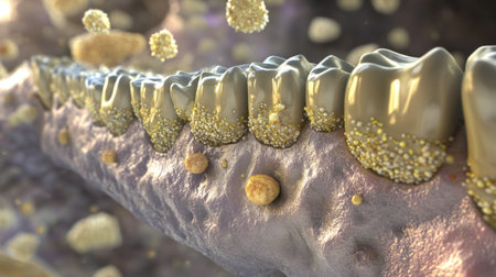 An intricate visual representation of bacteria on a tooth surface, highlighting significant interactions that contribute to oral health and hygiene issues, serving as a vital educational tool.