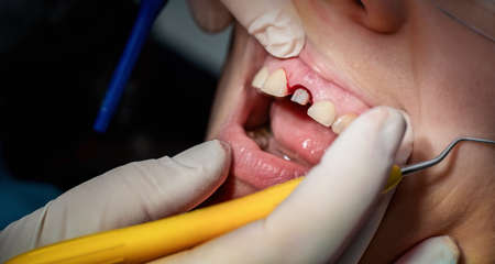 Selective Focus Child's teeth. An 8 year old little girl lost a baby incisor. Children's dentistry and oral hygiene concept. Macro shoot