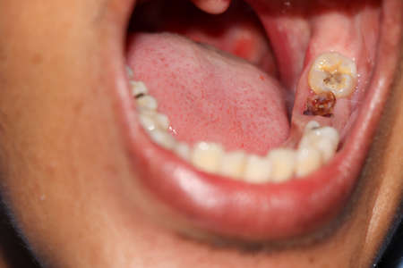 Close up human patient open mouth showing caries teeth decay with gingivitis.