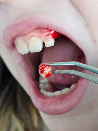 photo story about a boy of six years who had his first baby tooth. macro shot of lower jaw, gums, teeth
