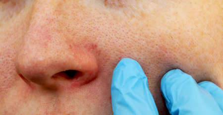 Cuperosis on the nose of a young woman. Acne on the face. Examination by a doctor
