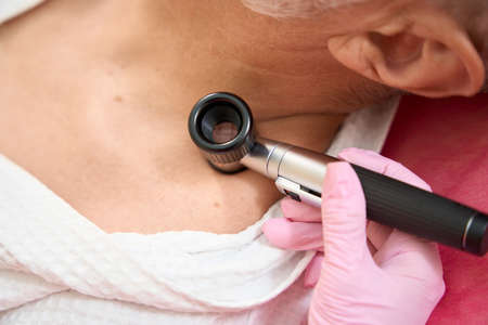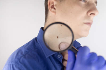 A man at a dermatologist appointment shows his birthmarks, moles and nevi. The doctor examines the patient with a dermatoscope. Benign and malignant birthmarks. Skin abnormalities care concept
