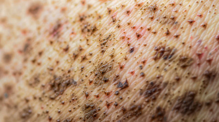 The image shows a close up of skin with a textured pattern. The skin is light brown and has many small, brown spots and a few red marks. The surface is textured with small bumps and ridges.