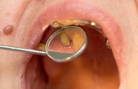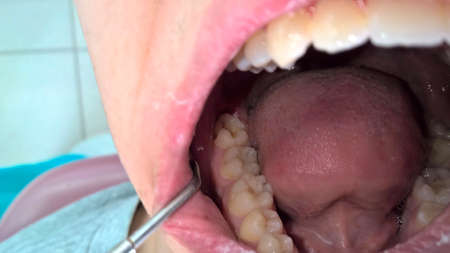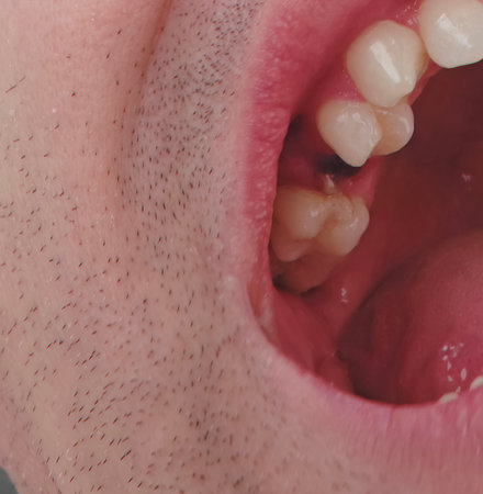 open mouth of a man with the place of a pulled out small molar tooth, healing of a wound in the place of the tooth.