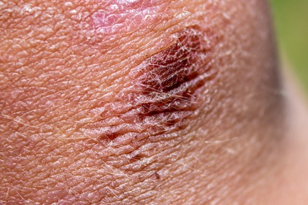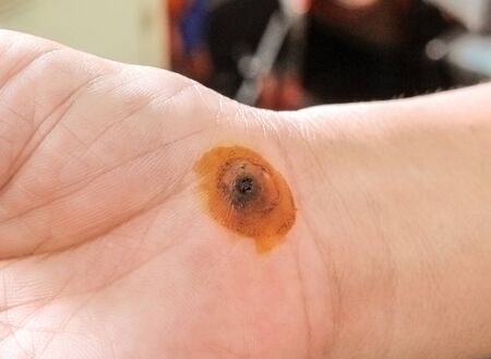 Close-up of the wound that remained after excision of the nevus. Removal and treatment of benign skin lesions. Surgery. Doctor and patient in one shot. Skin disease treatment and surgical care concept
