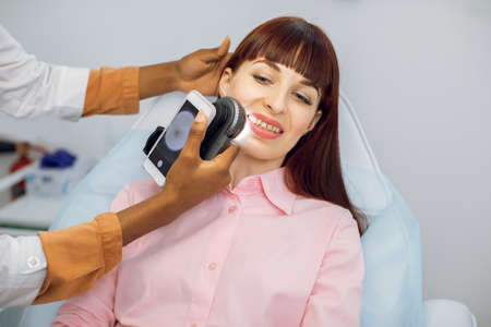 Smiling young Caucasian woman having appointment with her doctor dermatologist in the clinic. Unrecognizable female afro doctor examining patients skin with modern dermatoscope
