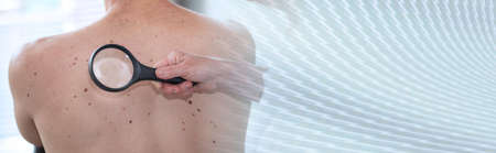 Doctor examines patients back with moles through magnifying glass. What malignant moles look like and why they are dangerous concept