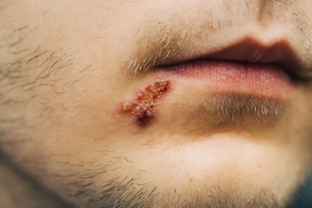 male unshaven mouth with short hair and dried herpes wound or ulcer covered with crisp near lips, closeup