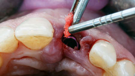 Close up process of male professional dentist surgeon performing operation install dental implant teeth of woman patient in clinic light office with modern tools equipment. Blood and pain on the face