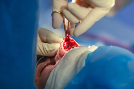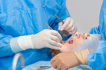Oral surgery, sewing up the wound with surgical needle