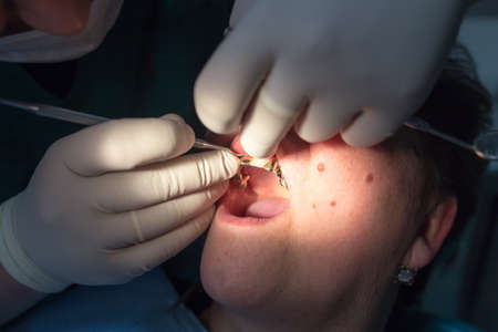 Installing a retainer after wearing braces. The process of removing braces.Beautiful woman in dental chair during procedure of installing braces to upper and lower teeth. Dentist and assistant working