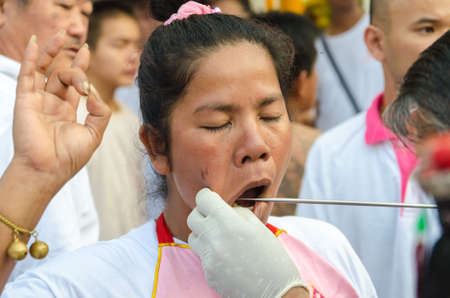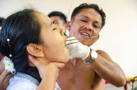 Phuket Vegetarian Festival. Shocking asian tradition - body piercing.