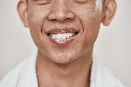 Close up of face of young man with problematic skin smiling after brushing his teeth with the foam of toothpaste left in his mouth isolated over white background
