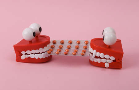Two Funny clockwork jumping teeth toy with pills on pink background.