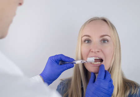 Clean tongue. The doctor teaches the patient how to clean the tongue properly. Dentist consultation. The blonde girl is trained in proper oral hygiene. Man and woman isolated on white background