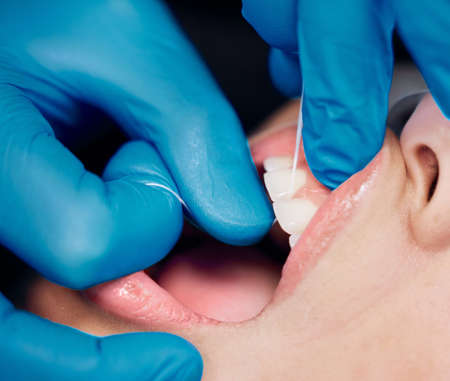 Dentist’s hands with special thread making hygiene in a patient's mouth. Close up.