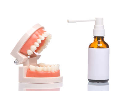 Human jaw model with throat spray isolated on white background with reflection