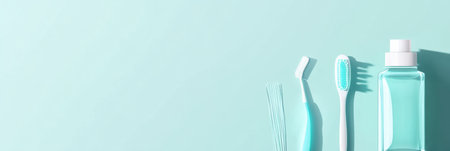 Set of dental hygiene items features a colorful toothbrush, dental floss, and refreshing mouthwash on a light blue background for a clean aesthetic.