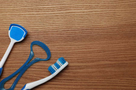 Tongue cleaners and toothbrush on wooden table, flat lay. Space for text