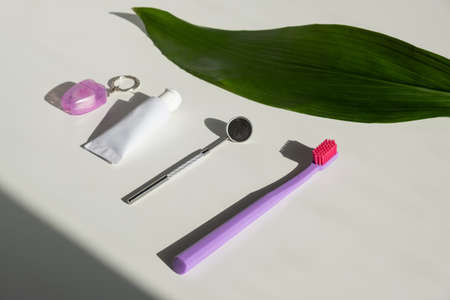 Oral hygiene products and a green leaf on a white table. Toothbrush dental floss dental mirror and dental paste.