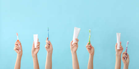 Set of different tools for dental care and hygiene. Top view, flat lay