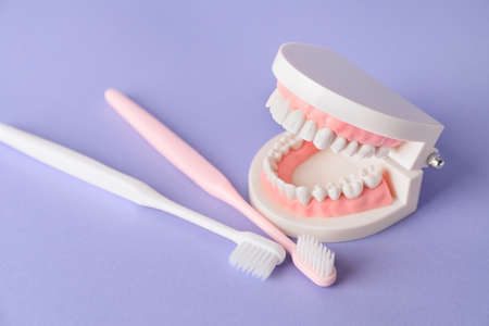 Jaw model and toothbrushes. The concept of how to properly brush your teeth or how to choose a toothbrush