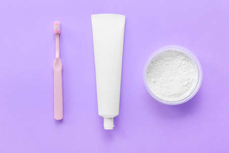 Minimalistic oral hygiene concept. Two toothbrushes with a tube of toothpaste, tooth powder on a pastel background. Teeth care. Top view