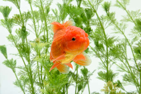 Close up orange goldfish in nature aquascape in fresh water aquarium.