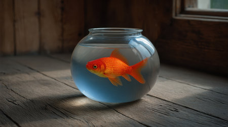 A captivating scene featuring an orange goldfish swimming in a round glass bowl. The fish is set against a warm wooden backdrop with gentle natural light, creating a peaceful ambiance.