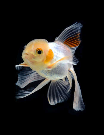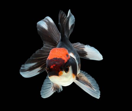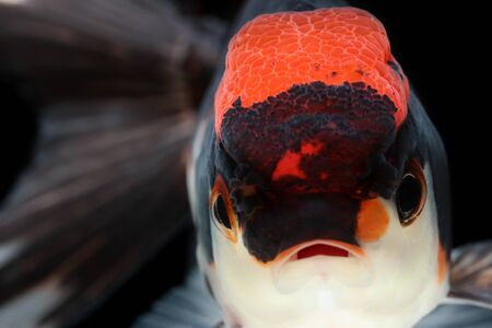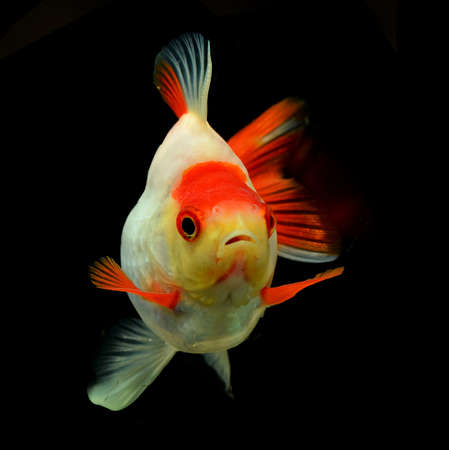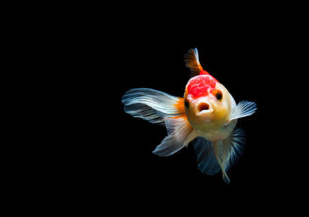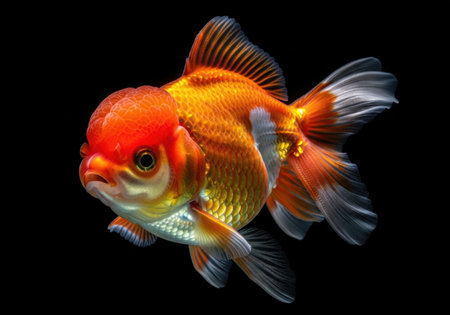 A goldfish, with striking red and white markings, is depicted against a stark black backdrop. The image showcases the fish's intricate fins and scales with detailed clarity. The lighting emphasizes the textures and colors of the subject. Suitable for use in various commercial and editorial projects.