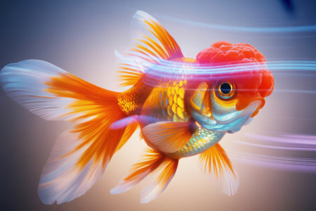 A detailed, AI-generated image captures a bright orange goldfish with flowing fins swimming gracefully. The blurry background features abstract streaks of light and color, creating a dynamic underwater scene.