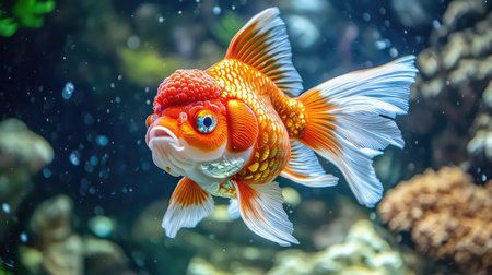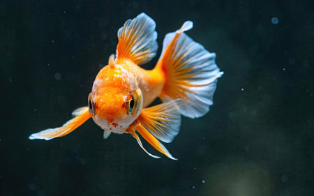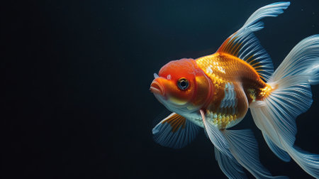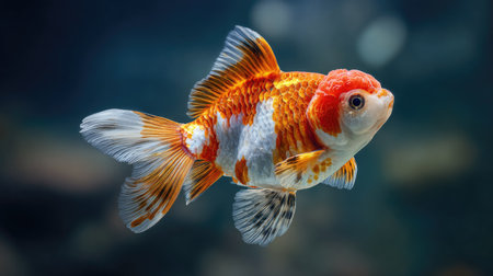 A detailed image captures a goldfish with orange and white markings. The fish is suspended in a dark blue environment. Its scales reflect light, and the composition focuses on the creature's features. This image could be used for various commercial projects and editorial content.