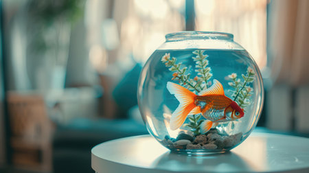 Beautiful bright small goldfish in round glass aquarium on white table indoors. Space for text --ar 16:9 Job ID: c9a5d482-2923-4d7c-a9cf-e293891f08e5