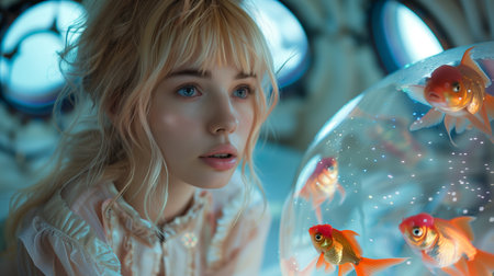 Young Woman Intently Observing Colorful Goldfish in a Transparent Sphere Underwater Setting