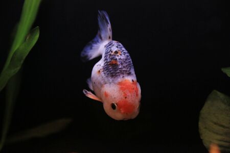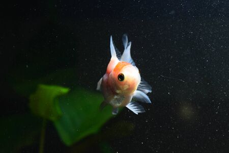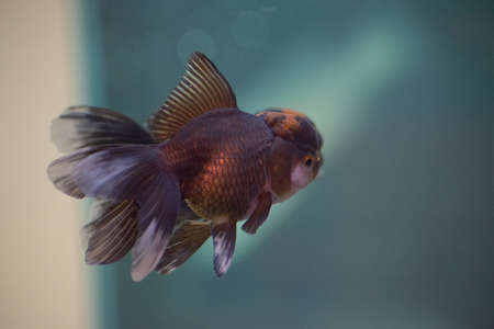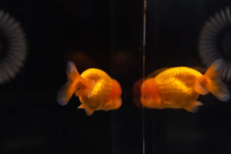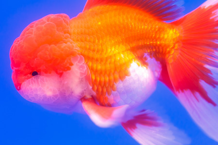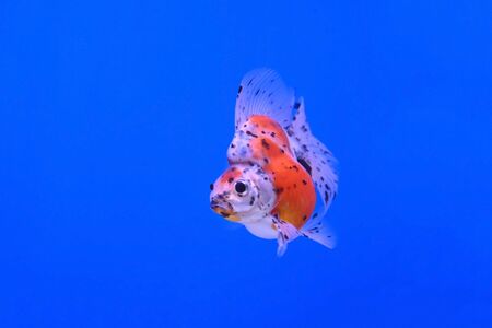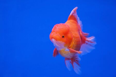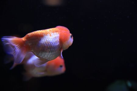 Beautiful goldfish swimming in a dark blue water. Close up.