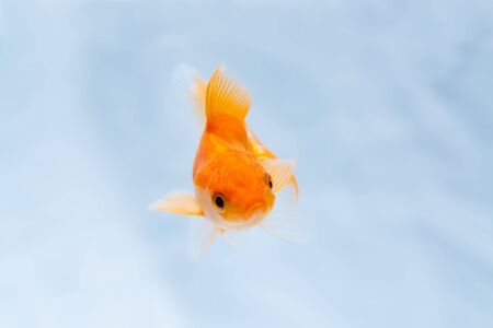 Gold fish or goldfish floating swimming underwater in fresh aquarium tank, marine life.