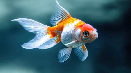 A goldfish, with striking orange and white patterns, gracefully swims in a well-lit aquarium. The close-up shot highlights the fish's details against a soft, blurred background. The image evokes a sense of tranquility and could be suitable for various commercial or educational applications.