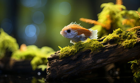 Goldfish swimming in the water, close up view, copy space. Photorealistic nature background with bokeh effect. AI generated.