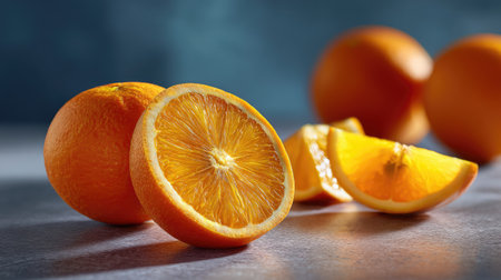 Bright orange slices, beautifully sliced and stacked against the background, create a fresh and juicy look. Ideal for cooking