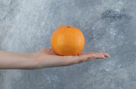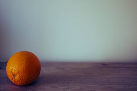 fresh orange on grey table, sparkling studio background, side view, selective focus